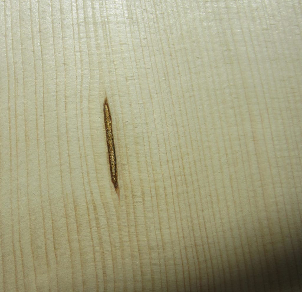 Beim Fertigen der Wölbung dieser handgespaltenen Decke sind vier Harzgallen zum Vorschein gekommen. Sie inspirierten zu einer rein ästhetischen bronzefarbigen Verzierung.